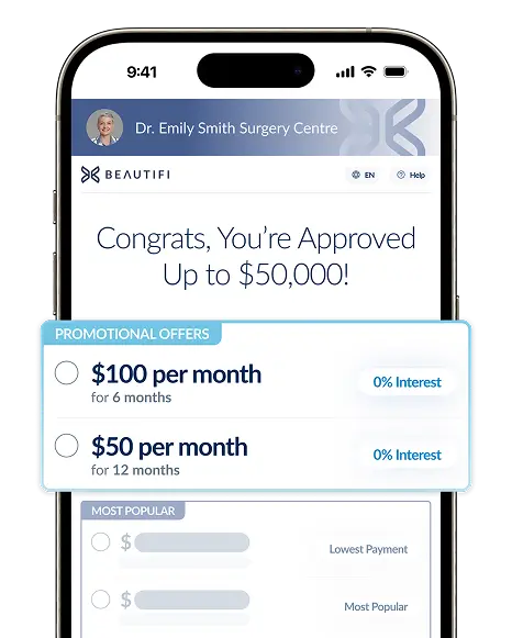 Many people initially think of putting their procedure on a credit card, but credit cards often come with high, compounding interest and no clear end date. With Beautifi, you get a fixed interest rate, a set term, and funded amounts designed specifically for medical and cosmetic procedures. That means you know exactly how long you’ll be paying and what your monthly payment will be, instead of a balance that lingers and grows.